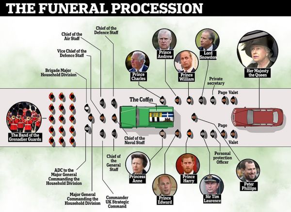 Οπως αναφέρει η Daily Mail, η βασίλισσα Ελισάβετ θα φτάσει στο νεκροταφείο με Bentley, ενώ οι πρίγκιπες Γουίλιαμ και Χάρι, δεν θα περπατήσουν δίπλα-δίπλα και δεν θα φορούν στρατιωτικές στολές. Η σύζυγος του Χάρι, Μέγκαν Μαρκλ, δεν θα παρευρεθεί λόγω εγκυμοσύνης.