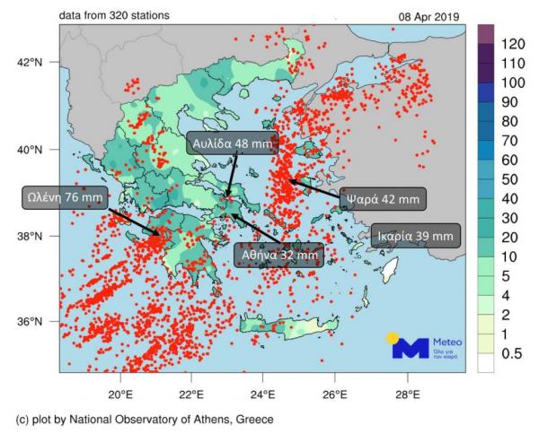 Τα μεγαλύτερα ύψη βροχής καταγράφηκαν σε περιοχές όπου εκδηλώθηκαν ισχυρές καταιγίδες (σύμφωνα με τις καταγραφές κεραυνών).
