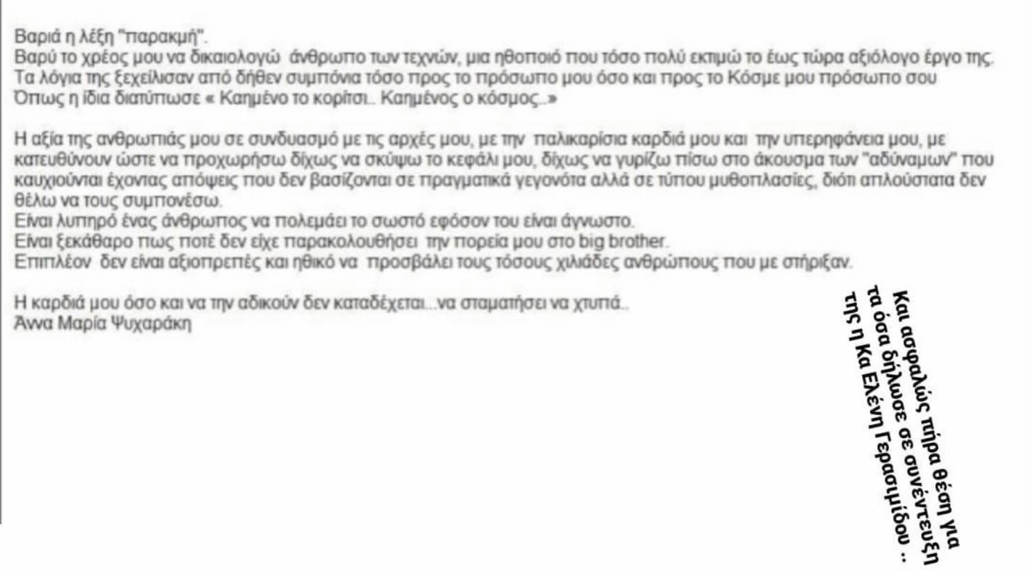 Η αξία της ανθρωπιάς μου σε συνδυασμό με τις αρχές μου, με την παλικαρίσια καρδιά κι υπερηφάνεια μου, με κατευθύνουν ώστε να προχωρήσω δίχως να σκύψω το κεφάλι μου, δίχως να γυρίζω πίσω στο άκουσμα των «αδύναμων» που καυχιούνται έχοντας απόψεις που δεν βασίζονται σε πραγματικά γεγονότα αλλά σε τύπου μυθοπλασίες, διότι απλούστατα δεν θέλω να τους συμπονέσω. Είναι λυπηρό ένας άνθρωπος να πολεμά το σωστό εφόσον του είναι άγνωστο. Είναι ξεκάθαρο πως ποτέ δεν είχε παρακολουθήσει την πορεία μου στο Big Brother.