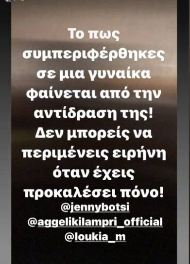 Η ηθοποιός μέσω ενός instastory έδειξε ξεκάθαρα την στήριξη της στις τρεις ηθοποιούς γράφοντας «Το πως συμπεριφέρθηκες σε μια γυναίκα φαίνεται από την αντίδρασή της. Δε μπορείς να περιμένεις ειρήνη όταν έχεις προκαλέσει πόνο.»
