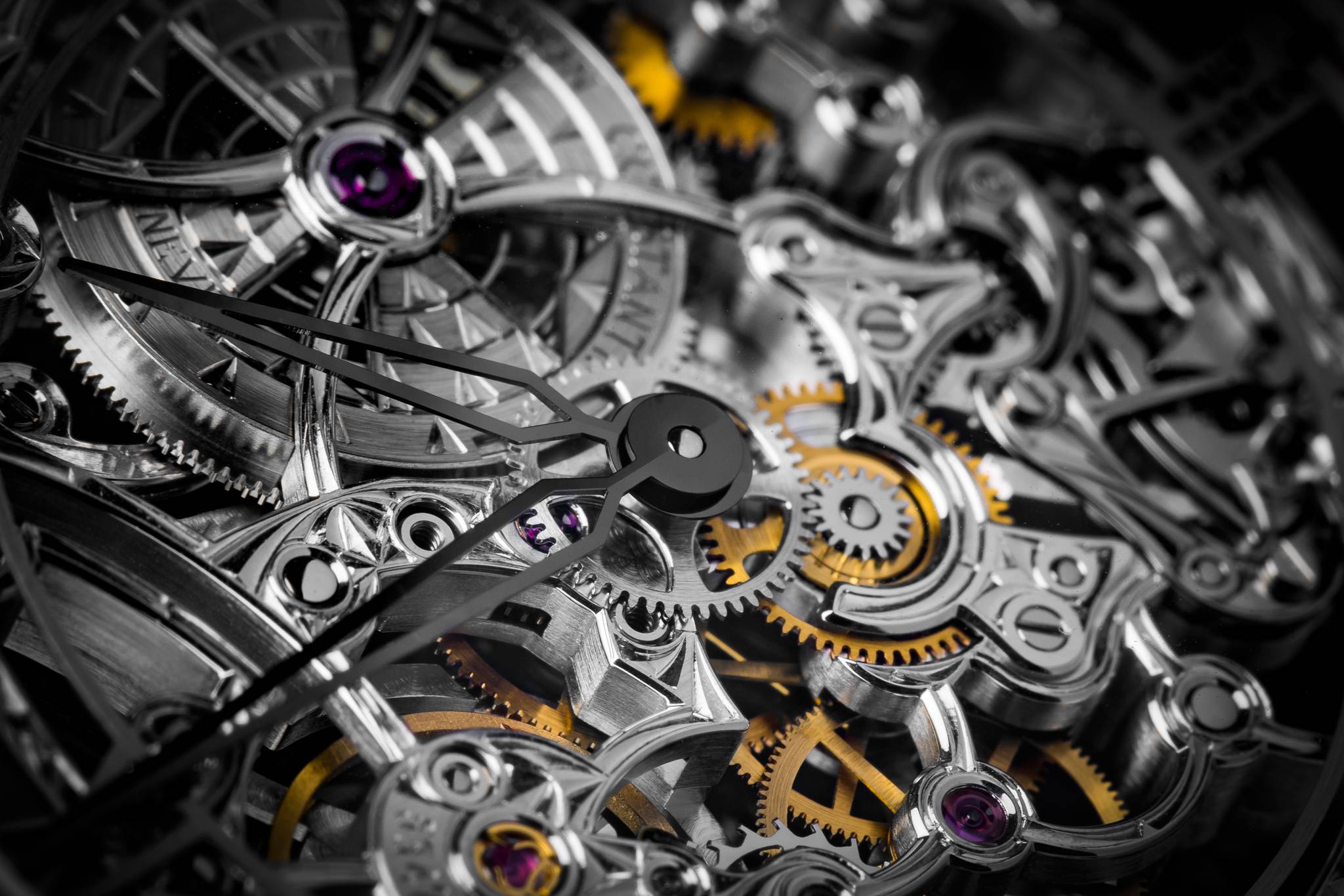 Οι ώρες και τα λεπτά βρίσκονται σε διαφορετικούς άξονες (1). Μπλε χέρια. (2) Στο πίσω μέρος θα δείτε ένα turbillon τριών αξόνων το οποίο στεγάζει (3) ειδικό σφαιρικό ελατήριο ισορροπίας και διαφυγής. Τα μικρά χρυσά χέρια δείχνουν διαφορετικές ζώνες ώρας(4). Δείκτης παγκόσμιας ώρας (5), όπως επίσης και (6) δείκτης νύκτας ή ημέρας (π.μ./ μ.μ).