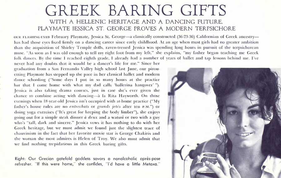 H Jessica St. George από την Καλιφόρνια ήταν η πρώτη Ελληνίδα που πόζαρε γυμνή για το Playboy το 1965. Η Miss Φεβρουάριος φωτογραφήθηκε για το περιοδικό με το στυλ που συνήθιζε τότε το Playboy: Τόπλες, λίγα ρούχα και πόζες που δεν αποκάλυπταν τίποτα παραπάνω ...