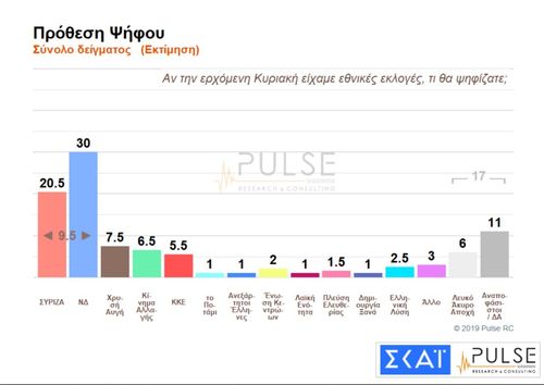 Στην τελευταία δημοσκόπηση της Pulse που παρουσιάστηκε στον ΣΚΑΪ, η διαφορά της ΝΔ από τον ΣΥΡΙΖΑ διευρύνθηκε ελαφρά, ενώ υψηλότατο είναι πλέον το ποσοστό που θέλει πρόωρες βουλευτικές εκλογές, είτε μαζί με τις Ευρωεκλογές είτε και νωρίτερα.