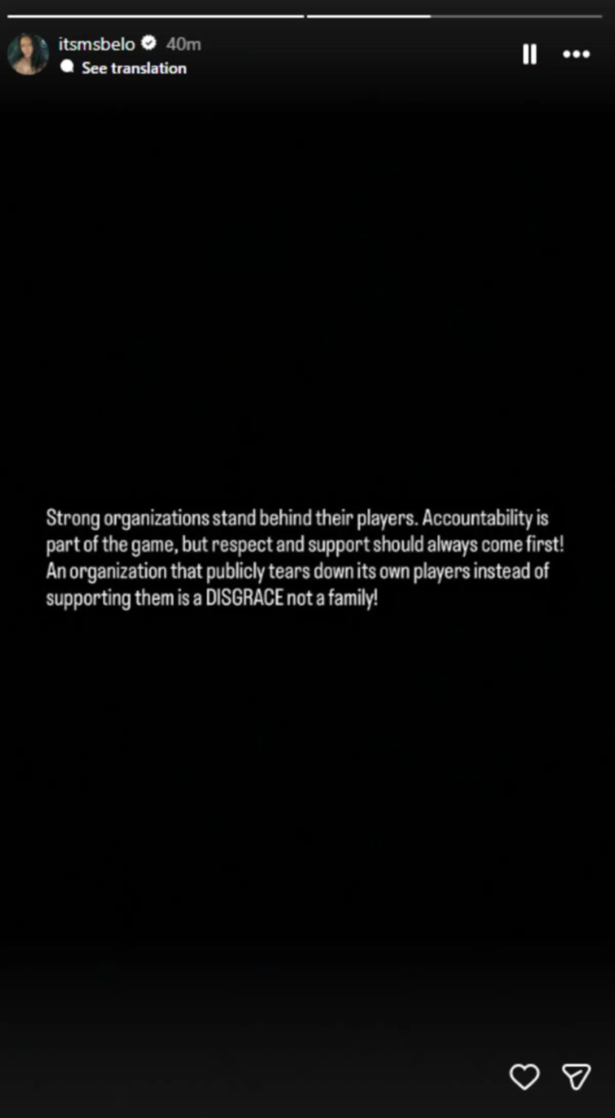 “Οι ισχυροί οργανισμοί στέκονται πίσω από τους παίκτες τους. Η ανάληψη της ευθύνης ειναι μέρος του παιχνιδιού, αλλά ο σεβασμός και η υποστήριξη πρέπει πάντα να προηγούνται! Ένας οργανισμός που κατακρίνει δημόσια τους αθλητές του αντί να τους υποστηρίζει είναι ντροπή, όχι οικογένεια”.