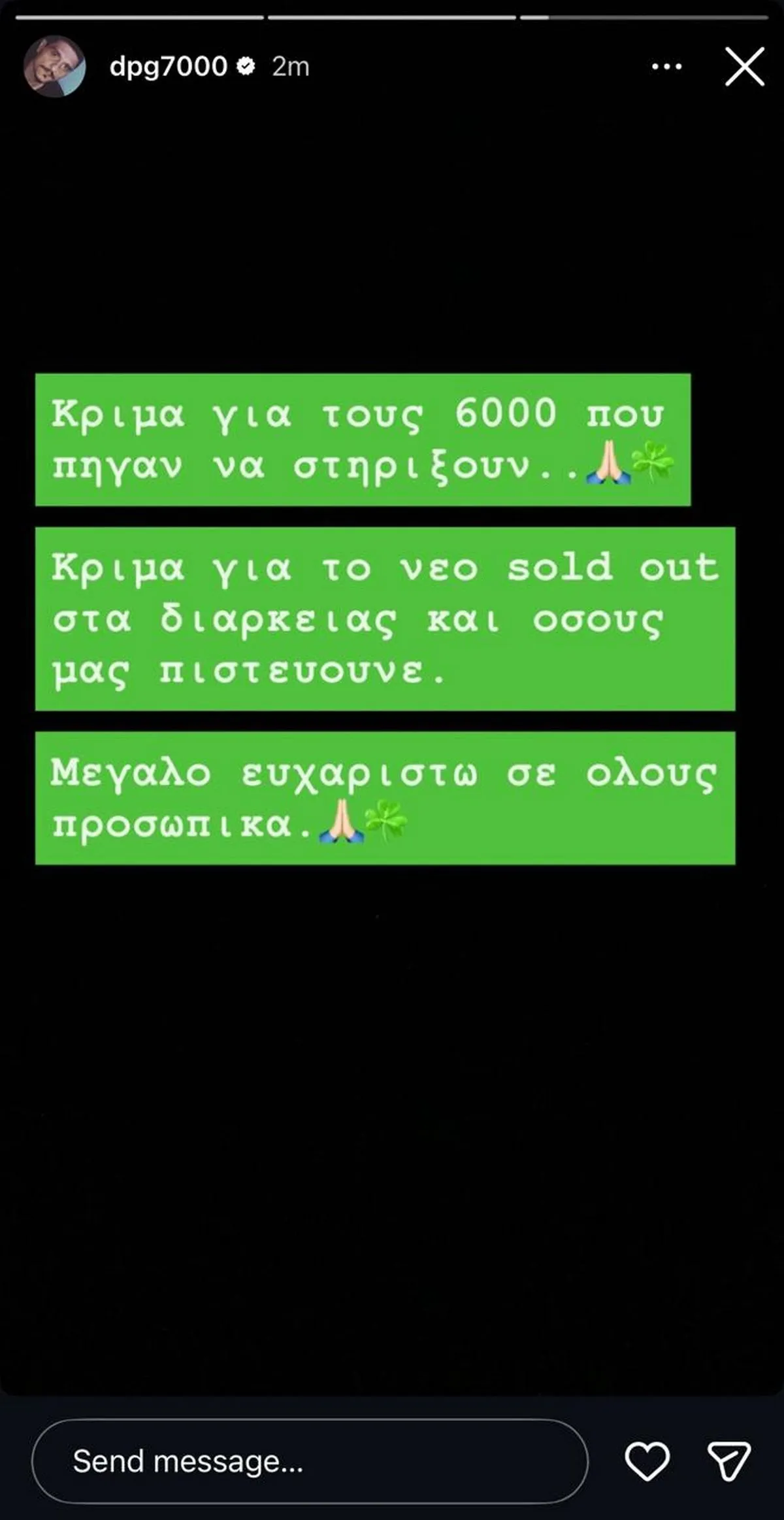 Συγκεκριμένα έγραψε: “Κρίμα για τους 6000 που πήγαν να στηρίξουν. Κρίμα για το νέο sold-out στα διαρκείας και όσους μας πιστεύουν. Μεγάλο ευχαριστώ σε όλους”.